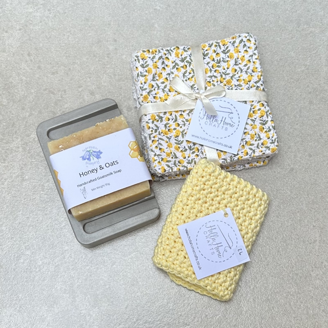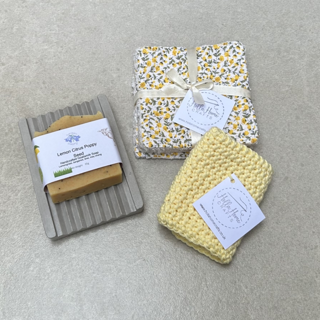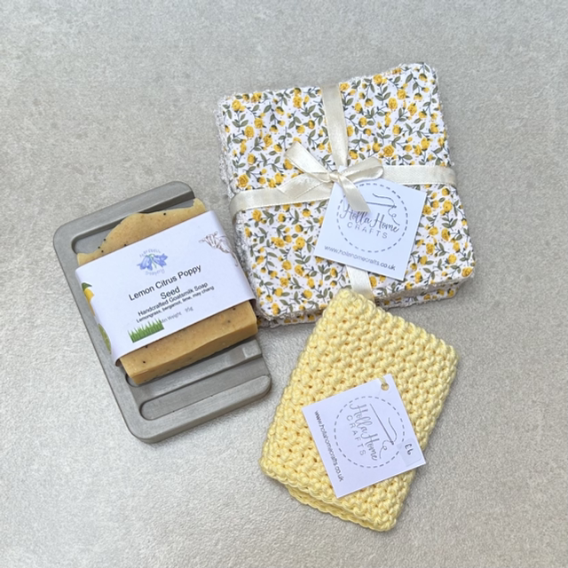 Who could fail to feel special when using these luxury bathroom sets. Even my husband has one ! The sets come in a range of colours and combinations on the website. The soap dishes, soaps and face wipes can be bought individually although are better value when bought together and also come in a white gift box with coordinating ribbon closure: The 7 face wipes are made from a super soft bamboo towelling with pretty cotton backing, measuring approximately 4 inches squared; the eco concrete soap dishes come in 2 designs to suit your positioning/style preference; the 100% cotton crochet flannel feels luxurious and thick; plus one of four gorgeous Harebells Soapery’s handmade goats milk soap bar.