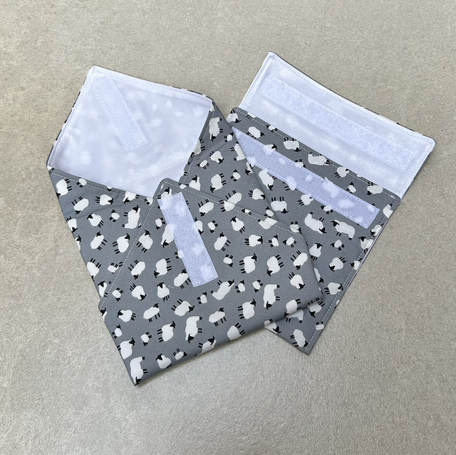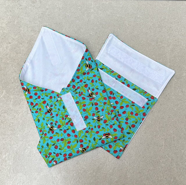 Alternative to cling film or foil, these eco sandwich wraps with matching snack bag are ideal for taking to school, the office or a day out. The inside has a wipe clean food grade PUL layer and pretty external cotton layer with Velcro fastening. The wrap opens up to create a napkin and adjustable to different sized bread. The snack bag holds a range of treats - veggies, fruit pieces, crisps or a granola bar/brownie. After use, wipe clean. Also machine washable at 30 degrees.